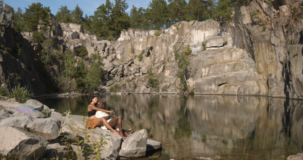 The film opens with a tender shibari session on a stone beach with the open sea as a backdrop. Then we follow the two lovers through a neon flickering sex club, when they have their first threesome, and – when they encounter jealousy and emotional stress due to their journey.