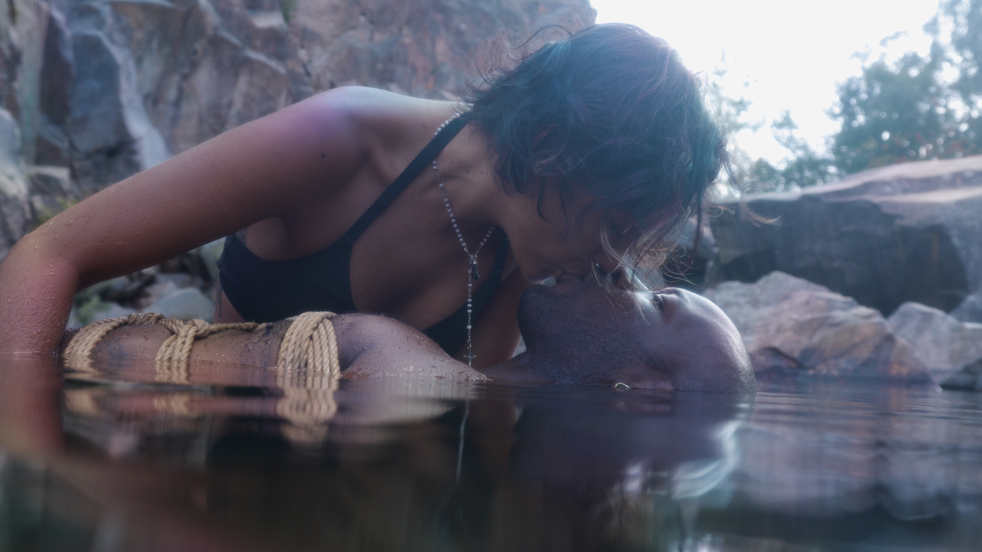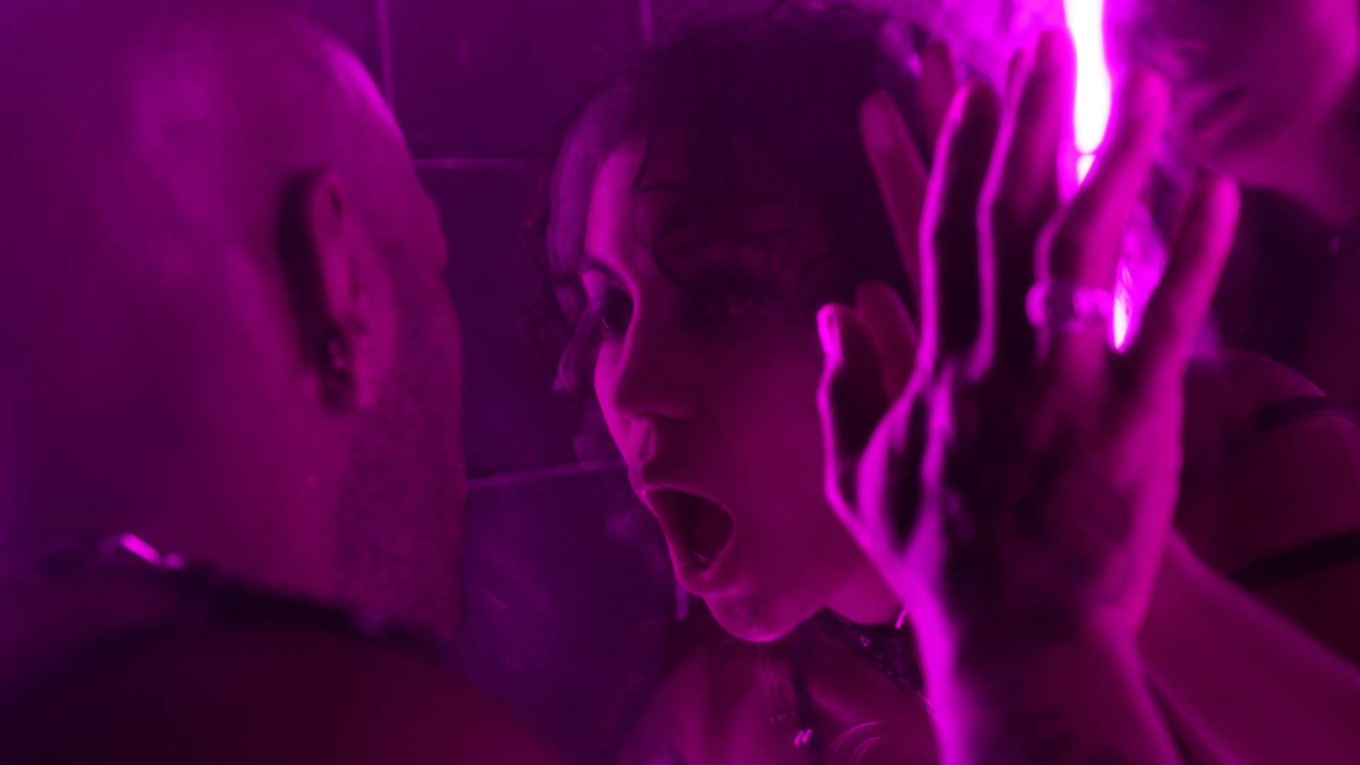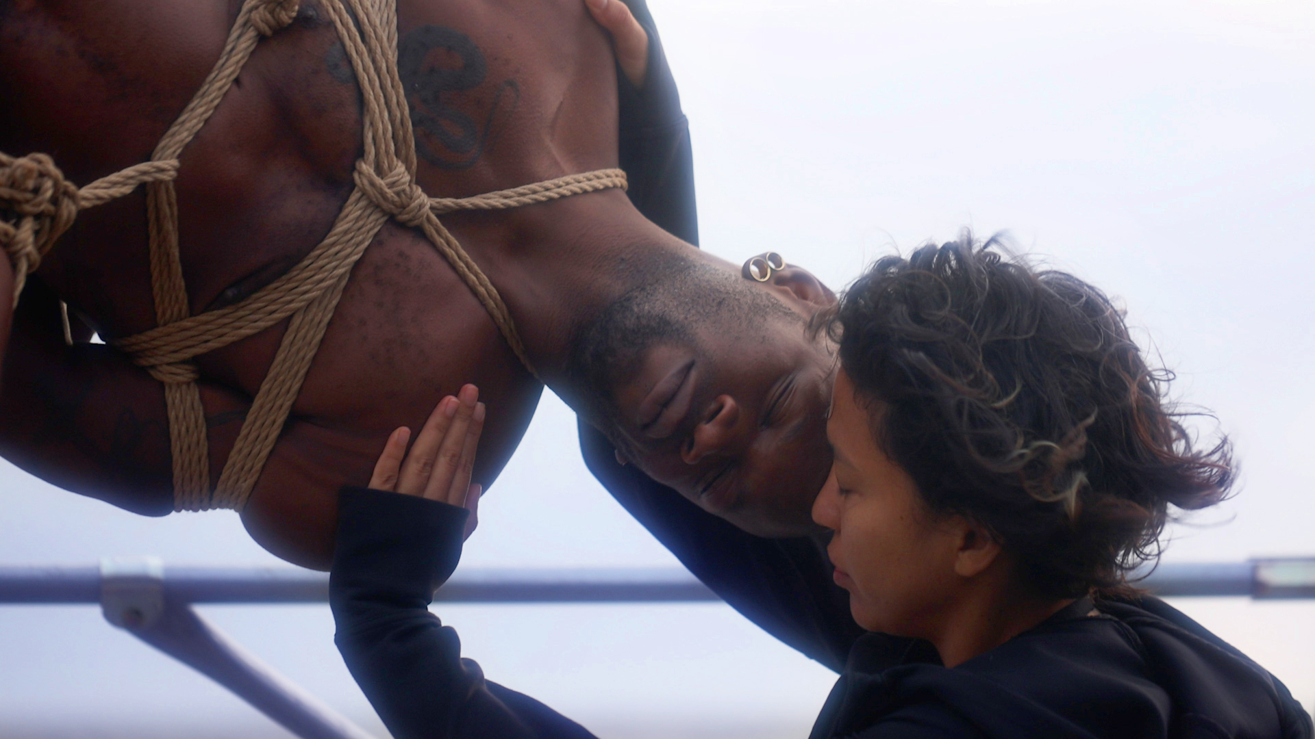 The film opens with a tender shibari session on a stone beach with the open sea as a backdrop. Then we follow the two lovers through a neon flickering sex club, when they have their first threesome, and – when they encounter jealousy and emotional stress due to their journey.